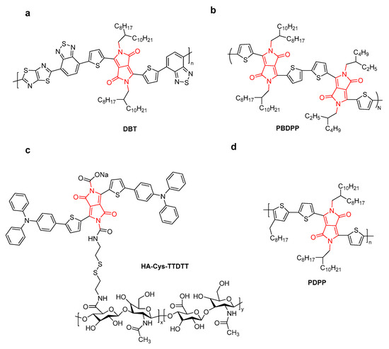 The structure of (a) DBT, (b) PBDPP, (c) HA-Cys-TTDTT, and (d) PDPP.
