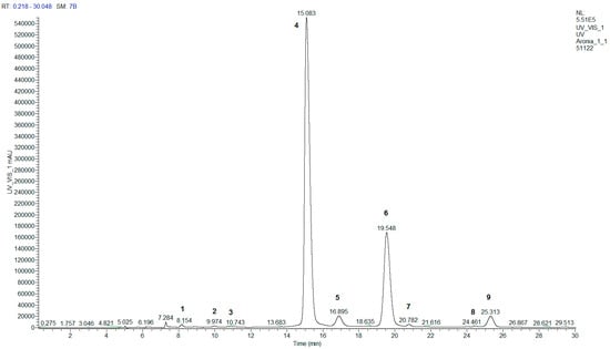 HPLC–DAD chromatogram of “Nadzeya” chokeberry fruit extract at 520 nm. The numbers of anthocyanin peaks in the chromatogram correspond to those in Table 1.