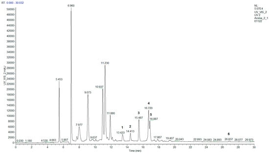 HPLC–DAD chromatogram of “Aron” chokeberry fruit extract at 350 nm. The numbers of flavonol peaks in the chromatogram correspond to those in Table 4.
