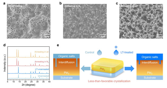 Top-view SEM images of (a) as-deposited, (b) annealing in N2, and (c) annealing in air perovskite films, respectively. The scale bar is 2 µm. (d) XRD patterns of various perovskite films: unannealed, LT-unannealed, annealing in N2, and annealing in air. (e) Schematic illustration (right side) of the mechanisms by which LT treatment retards the interdiffusion of organic cations and PbI2 under less-than-favorable crystallization conditions.