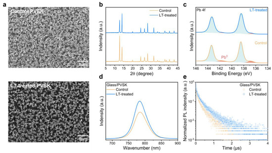 (a) Top-view SEM images, (b) XRD patterns, and (c) XPS spectra of Pb 4f of perovskite film with and without LT-treated. (d) ss-PL spectra and (e) tr-PL spectra of perovskite with and without LT-treated coated on glass.