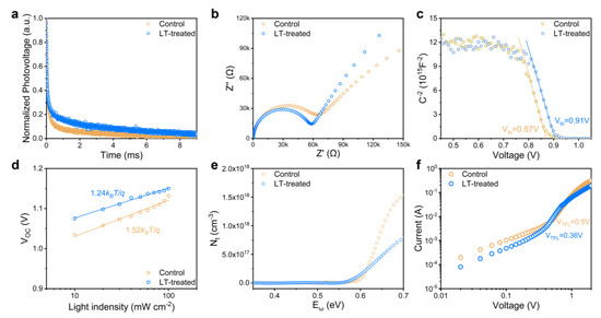 (a) Transient photovoltage (TPV) decay, (b) The Nyquist plots, (c) Mott-Schottky plots, (d) Relationship between VOC and the light intensity, (e) Calculated trap density (Nt), and (f) Dark J-V curves of electron-only devices for PSCs with and without LT-treated. The empty circles indicate the measured data, and the solid lines indicate the fitted curves in (c,d).