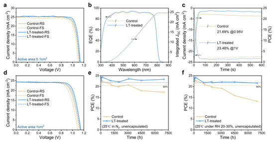 The external quantum efficiency (EQE) spectra of the corresponding devices are illustrated in Figure 4b. It can be observed that LT-treated devices exhibit an increased absorption over a broad wavelength range. The calculated integrated JSC values for the control and LT-treated devices were found to be 24.35 and 24.66 mA/cm2, respectively, differing by less than 5% from the JSC value obtained from the J-V measurement, suggesting reasonable values. Furthering our analysis in Figure 4c, we performed stable output power (SPO) measurements of the devices at a fixed bias voltage. The stable PCEs were recorded as 21.69% and 23.48% for the control and LT-treated devices, respectively, which are consistent with the PCE values obtained by the J-V measurement. To validate the effectiveness of the LT-treated strategy on a larger active area, we fabricated a 1 cm2 device presenting its J-V curves for champion efficiency in Figure 4d. Table S4 presents the corresponding photovoltaic performance parameters. We note that the PCE values for larger perovskite solar cells with an LT-treated strategy are marginally lower compared to those of 0.1 cm2 devices with reduced JSC and FF values. This trend could be attributed to the increased series resistance. The VOC values for the control and LT-treated devices were measured at 1.126 V and 1.147 V, respectively, while the JSC values were 24.21 mA/cm2 and 24.33 mA/cm2. The FF values were 74.46% and 77.21%, respectively, as shown in Table S4.