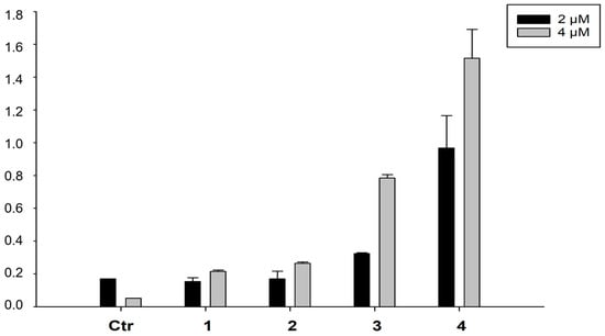 A number of research studies were performed on the elucidation of the mechanism of action of copper complexes in the past three decades. Despite several different molecular targets having been proposed for copper(II) complexes, DNA still represents one of the most substantiated when considering diamine ligands. On this basis, we thought it of interest to evaluate the ability of tested complexes to interact with DNA, both at molecular and cellular levels. An ethidium bromide (EB) displacement assay was used to understand if the complexes interact with the DNA at a molecular level. Compounds 3 and 4 displayed the highest quenching values and the relative fluorescence decrease was greater than 50% with binding constants of 2.53 × 107 M(bp−1) and 1.28 × 107 M(bp−1) for compounds 3 and 4, respectively (Figure 3). These values are very much in line with what was previously seen by us [25] and also very close to the reported literature values of 2.60 × 107 M(bp−1) and 3.04 × 107 M(bp−1) for the bis complexes of [Cu(phen)2]2+ and [Cu(DPQ)2]2+ reported by Molphy et al. [26]. Compounds 1 and 2 instead showed very small quenching and the binding constants were not determined. It is largely possible that the presence of the 1,10-phenanthroline scaffold on compounds 3 and 4 is contributing to the increased displacement of the EtBr (probably by intercalation) and leading to a more noticeable decrease in the fluorescence.