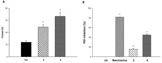 Mechanistic studies. (A) Comet assay: MDA-MDB-231 cells were treated for 3 h with 4 μM of tested compounds 2 and 4 or 200 µM of the reference drug chlorambucil. The relative percentage of comets (number of cells forming a comet/total number of cells) was detected in two randomly captured fields from two independent experiments. (B) PDI inhibition induced by tested compounds was measured by Proteostat PDI assay kit. The PDI inhibitor Bacitracine (0.5 mM) was used as a positive control. Error bars indicate S.D. ** p < 0.01 compared with control.