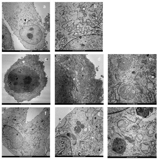 TEM analysis of MDA-MB-231 human breast cancer cells: (a,b) control cells; (c–e) cells treated for 24 h with IC50 concentrations of 2; (f–h) cells treated for 24 h with IC50 concentrations of 4.