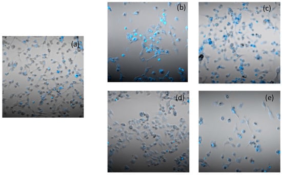 Hoechst staining of MDA-MB-231 cells: (a) control cells; cells incubated for 24 h (b) or 48 h (c) with IC50 of cisplatin; cells incubated for 24 h (d) or 48 h (e) with IC50 of 4.