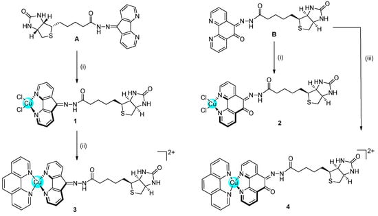 Inspired by these results, we here report the synthesis, characterization, and biological application of four novel Cu(II) complexes (1–4) with two different biotin-functionalized ligands A and B (Scheme 1). The addition of the biotin to the scaffolds of phenanthroline and dafone (4,5-Diazafluoren-9-one) will enhance not only the selectivity toward tumour tissues but also the hydrophilic features of the final complexes, which is an important characteristic for biological applications. The in vitro anticancer potential of these complexes has been investigated on 2D and 3D cancer-cell models; additionally, cell-free and in-cell studies were carried out in order to elucidate their mechanism of action.