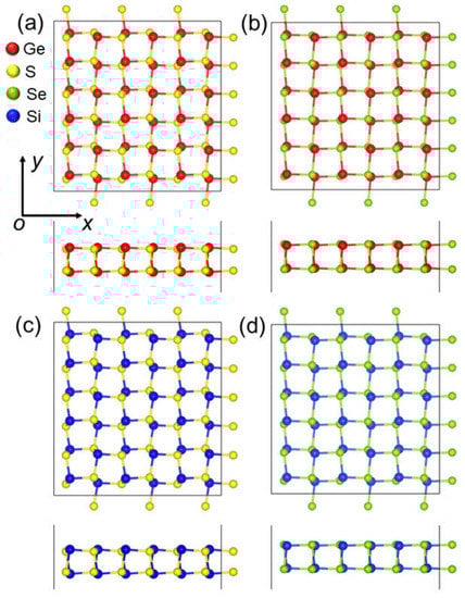 The top and side views of the atomic structures of the (a) GeS, (b) GeSe, (c) SiS and (d) SiSe monolayers.