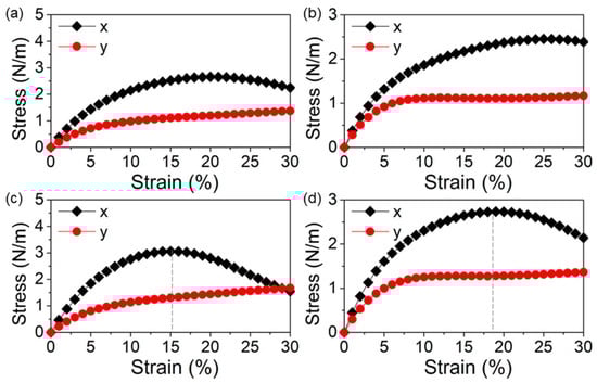 The mechanical capacities of the δ-GeS, δ-GeS, δ-SiS and δ-SiSe monolayers were calculated by investigating the stress–strain response, as shown in Figure 2. The δ-GeS, δ-GeS, δ-SiS and δ-SiSe monolayers were more elastic in the x direction than the y direction. Through the linear fitting of the initial range (within 5%), the obtained Young’s moduli (E) of the δ-GeS, δ-GeS, δ-SiS and δ-SiSe monolayers were defined as E = ΔStress/ΔStrain, obtained to be approximately 34 N·m−1, 30 N·m−1, 39 N·m−1 and 28 N·m−1, respectively, along the x direction. Meanwhile, the Young’s moduli are calculated as 21 N·m−1, 15 N·m−1, 17 N·m−1 and 20 N·m−1, respectively, along the y direction for the δ-GeS, δ-GeS, δ-SiS and δ-SiSe monolayers, in accordance with our other report [30]. The SiS and SiSe monolayers have yield strengths of approximately 3.13 N·m−1 and 2.72 N·m−1 at the strains of 15% and 18% in the x direction, respectively, as shown by the gray dashed lines in Figure 2c,d.