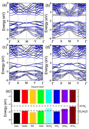The band structures of the δ-GeS, δ-GeS, δ-SiS and δ-SiSe monolayers shown in Figure 3 were determined using the PBE and HSE06 methods. One can see that all these monolayers are semiconductors, with bandgaps of approximately 2.65 eV (1.92 eV), 2.20 eV (1.60 eV), 2.15 eV (1.42 eV) and 2.08 eV (eV), being functional according to HSE06 (PBE). In Figure 3a–d, the δ-GeS, δ-GeS, δ-SiS and δ-SiSe monolayers possess almost exact bandgap structures, and the obtained bandgaps of these monolayers imply their decent application potential as photocatalysts for water splitting (larger than 1.23 eV) [38]. Furthermore, the band edge positions of these IV–VI monolayers are shown in Figure 3e at pH 0. Evidently, the δ-GeS, δ-GeS, δ-SiS and δ-SiSe monolayers demonstrate the sufficient energy of the CBM and VBM to induce the reductions and oxidations for water splitting. For comparative purposes, the band alignments of some TMD materials are also shown in Figure 3e, where one can see that only the WS2 monolayer has a suitable band energy for redox.