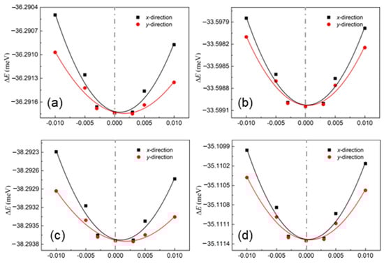 where the temperature is explained by T, e is the electron charge, the Planck constant is determined by , and kB is the Boltzmann constant. The change in the band edge of these layered materials is evaluated using the deformation potential (Ed). It is worth noting that the obtained deformation potentials are compared based on the vacuum level. Moreover, the elastic modulus is used with C, which is obtained using . Here, the total energy of the system is E and the area of the system is S. The energy differences among these δ-IV–VI monolayers are shown in Figure 4, and the fitted elastic moduli are summarized in Table 1.