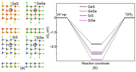 Furthermore, the most favorable H-adsorbed sites of the systems are demonstrated in Figure 6a, and the calculated Gibbs free energies of these H-adsorbed GeS, GeSe, SiS and SiSe monolayers are obtained as −1.775 eV, 2.480 eV, 2.569 eV and 2.965 eV, respectively, as shown in Figure 6b. One can see that the GeS possesses an advantageous HER ability, which is even smaller than that of the MoSi2N4 (2.79 eV) and MoSi2N4 (2.51 eV) monolayers [46].