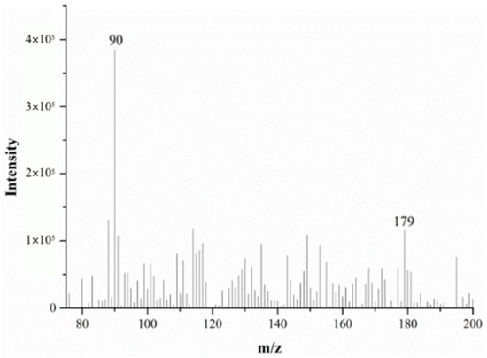 The full-scan mass spectrum of alanine is shown in Figure 6; both the mass spectrometer and DART ion source were in the positive ion mode. The relative molecular mass of alanine is 89.09. As can be seen from Figure 6, the characteristic alanine ions were m/z 90 and m/z 179. After the DART-MS/MS analysis of the two characteristic ions, as shown in Figure 7 and Figure 8, it was indicated that m/z 90 and m/z 179 were the [M+H]+ and dimeric ion [2M+H]+, respectively. As seen in Figure 7, m/z 44.3 was the only product ion of m/z 90, which shows that m/z 90.0 is more inclined to lose HCOOH to produce m/z 44.3 than to dehydrate. In addition to m/z 90 and m/z 44.3, the product ion m/z 179 also contained the low-intensity ion m/z 161, indicating that the dimeric ion [2M+H]+ underwent a dehydration reaction during dissociation and then generated m/z 161.