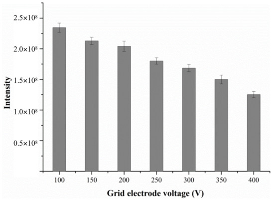 In order to obtain the optimal mass spectra and good signal intensity for target compounds, the grid electrode voltage was optimized in the pre-experiment by raising it from 100 V to 400 V, as shown in Figure 4. The data shows that as the grid electrode voltage increases from 100 V to 400 V, the response intensity of alanine gradually decreases. Thus, the grid electrode voltage was set to 100 V.