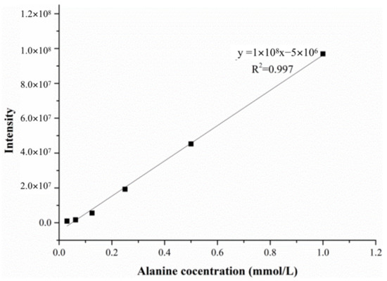 In order to eliminate the effect of matrix effects, a matrix solution similar to the that of the enzyme reaction was added during the establishment of the calibration curve, so that the standard solution and the sample solution had similar ionization conditions. The matrix solution was composed of 0.004 mol/L sodium pyruvate, 0.067 mol/L PBS and ultrapure water at a volume ratio of 1:2:1. The calibration curve solution was prepared in a 4:1 ratio of the matrix solution and alanine standard solution, and the concentration of the alanine in the calibration curve solution ranged from 0.03 mmol/L to 1.00 mmol/L. The linear calibration curve and correlation coefficients were y = 1 × 108x − 5 × 106 and R2 = 0.997, as shown in Figure 10.