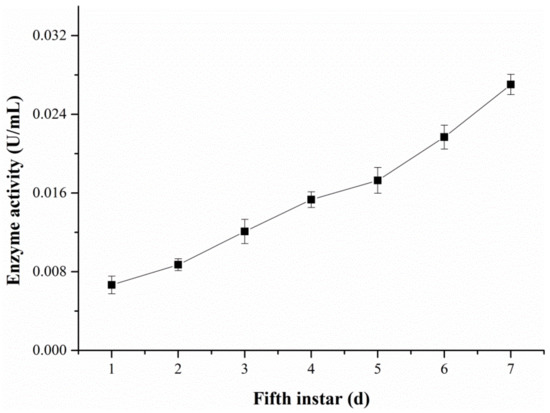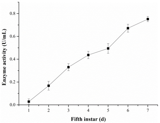 The changes in the ALT activity in hemolymph were examined with the DART-MS and Reitman–Frankel methods, respectively (Figure 11 and Figure 12). Figure 11 reveals that the activity level of ALT detected via DART-MS increased progressively from the first day to the seventh day of the fifth-instar larvae. Although little fluctuation exists in the results, the enzyme activity determined via the Reitman–Frankel assay presented a similar upward trend in total.