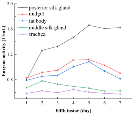 Silkworm Bombyx mori L. is a holometabolous lepidopteran insect and an agriculturally important species with high economic value; it has been completely domesticated by human beings for thousands of years. More recently, Bombyx mori L. was used as a model creature in scientific research [1,2] and other fields. The growth and development of Bombyx mori can be divided into four stages: eggs, larvae, pupa and adults. The fifth instar is the metamorphosis transition period from larvae to pupae and is also a stage of a large amount of silk biosynthesis and spinning. During this period, larvae ingest almost all nutrients for the whole process of their remaining life [2]. The posterior silk gland, midgut, fat body, middle silk gland, trachea and hemolymph are important tissues in the silkworm’s growth and development, and have various functions such as nutrition absorption, digestion, fibroin synthesis, and even immunity, etc.