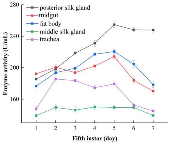 The ALT activity in the posterior silk gland was slightly lower at the initial stage of the fifth instar, which then sharply increased and reached the maximum on the fifth day. The variation tended to become less pronounced in the middle and late period. Figure 13 showed that ALT activity in the posterior silk gland was significantly higher than that in the other tested tissues. The ALT activity in the midgut increased gradually at the prophase, rose to its maximum on the fourth day, and declined in the following days. The ALT activity of the fat body also showed an upward trend in the start stage, reached its maximum on the fifth day and then decreased in subsequent days. The ALT activity in the middle silk gland had a high level in the early fifth instar, increased slowly in the middle stage and diminished in the late stages. The ALT activity in the trachea was the lowest in all the tested tissues and fluctuated in a small range during the seven days of the fifth instar, which might imply that the trachea is not an important tissue for ALT.