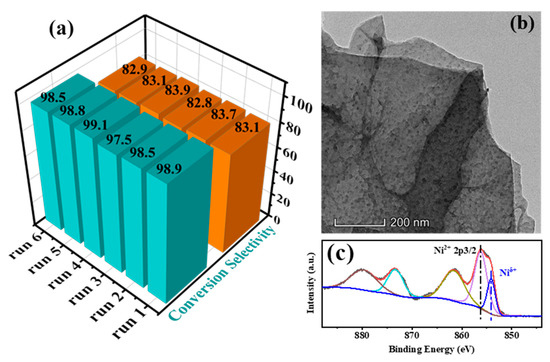 (a) recycling tests of selective hydrogenation of cinnamaldehyde over Ni/SiO2@N7C catalyst; (b) HRTEM image; and (c) XPS Ni 2p spectra of the used samples. Reaction conditions: 50 μL CAL, 50 mg catalyst, 6 mL ethanol as solvent, 2 MPa H2, reaction temperature 100 °C, and reaction time 2 h.