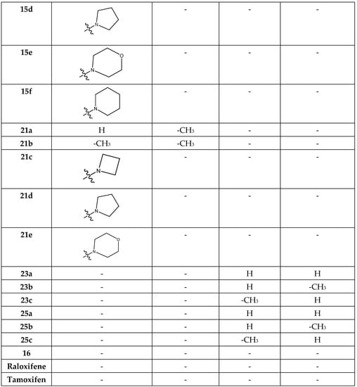 - Bai, C.; Wu, S.; Ren, S.; Zhu, M.; Luo, G.; Xiang, H. Benzothiophene derivatives as selective estrogen receptor covalent antagonists: Design, synthesis and anti-ERα activities. Bioorg. Med. Chem. 2021, 47, 116395. [Google Scholar] [CrossRef] [PubMed]