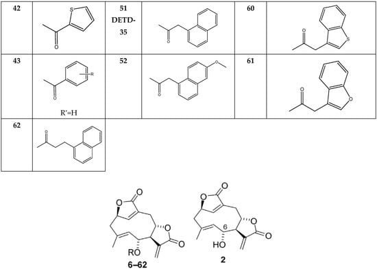 - Zhang, S.; Won, Y.-K.; Ong, C.-N.; Shen, H.-M. Anti-Cancer Potential of Sesquiterpene Lactones: Bioactivity and Molecular Mechanisms. Curr. Med. Chem.-Anti-Cancer Agents 2005, 5, 239–249. [Google Scholar] [CrossRef]