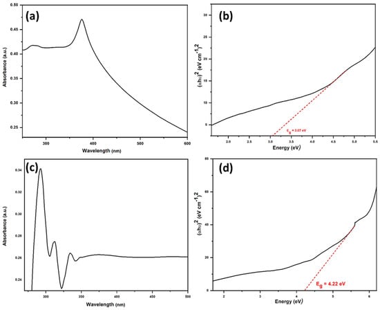 UV-vis spectroscopy was used to study the optical properties of synthesized zinc molybdates (Figure 1a). According to the UV spectrum, there was a sharp absorption peak at 376 nm and a broad peak at 272 nm. Typically, the optical band gap (Eg) of nanomaterial can be estimated by the classical Tauc approach [27], which presents the relationship between the incident photoenergy (hν) and the absorption coefficient (α) near the absorption edge as follows