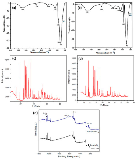FTIR spectra of (a) ZnMoO4 and (b) Mn-ZnMoO4 nanomaterial. XRD patterns of (c) ZnMoO4 and (d) Mn-ZnMoO4 nanostructures. (e) Full XPS spectra of ZnMoO4 and Mn-ZnMoO4 nanomaterials.