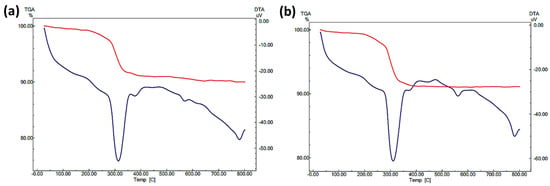 TGA and DTA analysis of (a) ZnMoO4 nanomaterials and (b) Mn-doped ZnMoO4 nanomaterials. TGA is represented by the red line, and DTA is represented but the dark blue line.