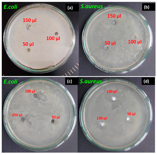 It was clear that ZnMoO4 produced a minimum ZOI for E. coli (Figure 5a). However, in the case of S. aureus, there was a good ZOI and a better response (Figure 5b). The clear area around the sample indicates complete inhibition. Comparatively, Mn-doped ZnMoO4 (Figure 5c,d) showed a good ZOI and a better response for the bacterial response to both (a) E. coli and (b) S. aureus. Therefore, antibacterial activity was higher for Mn-doped ZnMoO4 than ZnMoO4 against both bacterial strains.
