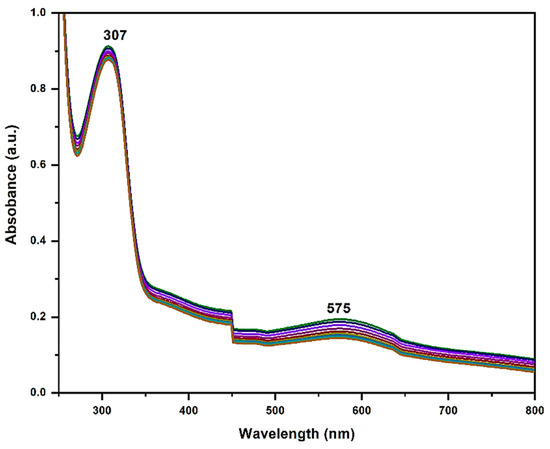 In the presence of light and air, 40 mg ZnMoO4 was added to 10.0 mL aq. solution of 50 ppm SDB (pH = 6). With a constant time (10 min) interval, ZnMoO4 degraded the SDB (Figure 7a). After 120 min, the blue solution became colorless (Figure 7b). With increased time, a decrease in the absorption of blue color was observed at a constant time interval and a 420 nm wavelength (Figure 7c).