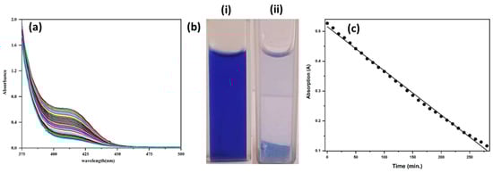 (a) Photocatalytic SDB degradation of ZnMoO4 under visible light and light at a 420 nm wavelength. (b) With the naked eye: (i) aq. solution of 50 ppm SDB (blank); (ii) after 120 min, the blue color of the solution degraded with 40.0 mg undoped ZnMoO4. (c) At 420 nm wavelength after adding ZnMoO4 in solution with increased time, there was decrease in the absorption in the presence of light and air.