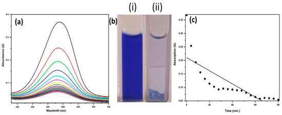 For comparison, 40.0 mg Mn-doped ZnMoO4 was added to 10.0 mL aq. Solution with a concentration of 50 ppm SDB (pH = 6) in the presence of light and air with a constant time (10 min) interval. Mn-doped ZnMoO4 degraded the dark blue color of the solution at a wavelength of 588 nm (Figure 8a). After 80 min, the blue solution turned colorless (Figure 8b). With increased time, a decrease in the absorption of blue color was observed when the time interval was held constant with a wavelength of 588 nm (Figure 8c).