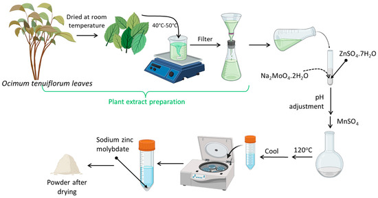 Leaves of Ocimum Tenuiflorum were collected in January 2022 from a natural ecosystem at India. Plant leaves were washed with double-distilled water to remove impurities and dried at room temperature (25 °C). Subsequently, the washed plant leaves (100 g) were boiled with distilled water (110 mL) at 40–50 °C. The whole extract solution was filtered using Whatman filter paper No. 42 and stored at 4–5 °C. Then, the extracted filtrate was used in the synthesis of zinc molybdate nanomaterials.