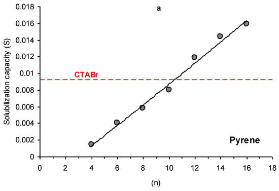 The solubilization capacity of PyPheOCn surfactants (n = 4, 6, 8, 10, 12, 14, 16) was evaluated, related to model representative PAH (naphthalene, anthracene and pyrene) and compared with the solubilization capacity of the widely used conventional cationic surfactant cetyltrimethylammonium bromide (CTABr) (Table 1).