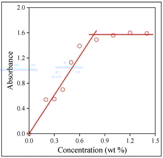 The solubility of the drug in the polymers was determined by a simple but efficient method used successfully earlier for the determination of the solubility of small-molecular-weight compounds in various polymers [,]. The method is demonstrated in Figure 2. The intensity of the characteristic absorbance of the drug is proportional to its concentration in thin films until the compound is dissolved and distributed at the molecular level. When the solubility limit is reached, the drug precipitates and forms a separate phase. Accordingly, the intensity of absorption does not increase further or just proportionally to the surface of the particles dispersed in the polymer. As Figure 2 shows, the solubility of Levo in HPMC is limited, much smaller than the amount added to the polymer during electrospinning. The discrepancy must be accounted for later. The solubility of the three polymers is listed in the third column of Table 1.