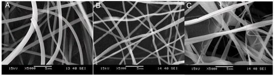 SEM micrographs recorded on the electrospun fibers prepared from the three carrier polymers: (A) PVP, (B) PVA, and (C) HPMC.