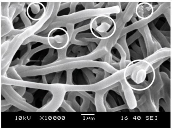 The drug is definitely incorporated into the device prepared by electrospinning, but it can be located within or among the fibers []. The crystals of the precipitated drug could be observed clearly among the fibers earlier on SEM micrographs []. In this study, no crystals could be found among the fibers in any of the polymers, but according to some micrographs, particles of the drug seem to be located within the fibers as a separate phase. Such particles are shown by white circles in the micrograph presented in Figure 7. Naturally, SEM micrographs cannot offer unassailable proof of the presence of the particles, but the results are in accordance with previous ones related to solubility (Section 2.2) and structure (Section 2.3).
