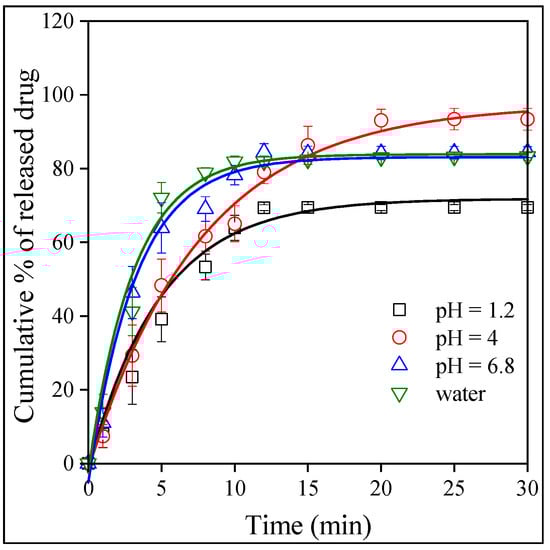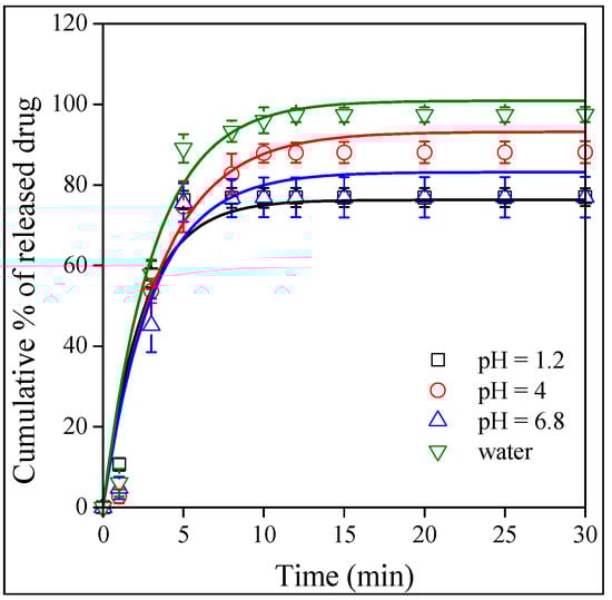 The results presented in Figure 8, Figure 9 and Figure 10 indicate that the amount of the released drug is approximately the same for all the polymers under all conditions (pH), and it changes somewhere between 80 and 100%. The release rate seems to vary more significantly as a function of pH and the type of the polymer, but our visual observation does not allow for an exact estimation of the differences. A quantitative evaluation needs a model that allows for the determination of the rate of release. The kinetics of dissolution can be described by the Noyes–Whitney equation [] as follows:
