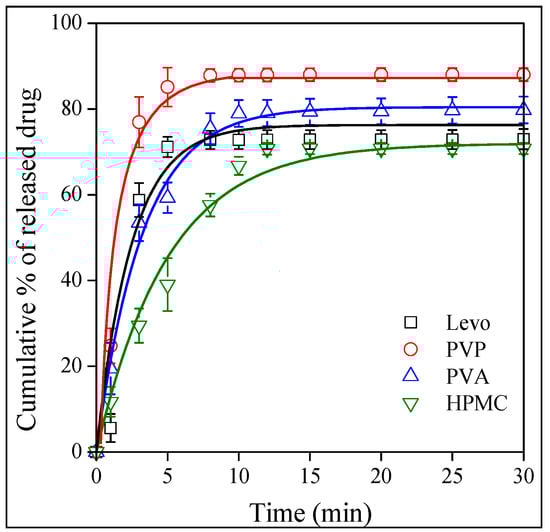 The goal of any drug formulation is to achieve the best bioavailability possible, which depends on solubility and permeation. The release of the drug was studied as a function of pH. Contrary to a previously studied drug, valsartan [], the dissolution of the neat drug depended only slightly on the pH of the medium as shown by Figure 8. The dependence of the dissolved amount is inconsequent, which might be the result of experimental error, but always reaches almost 80%. The results show that, as a BCS III drug, the solubility of Levo is good. The situation is very similar in the case of the fibers. The release from the HPMC fibers is presented in Figure 9. The amount of the released or dissolved drug is very similar as for neat Levo, but differences can be seen in the rate of release. The release rate is the slowest at a pH of 1.2 and somewhat faster in distilled water and at a pH of 6.8. The effect of the type of the polymer on the rate of drug release is compared in Figure 10 at a pH of 1.2. The results clearly show that compared to the dissolution of the neat drug, the release rate is faster in PVP and slower in HPMC, while approximately the same in PVA as for neat Levo. Obviously, the rate of drug release can be adjusted by the selection of the carrier polymer.