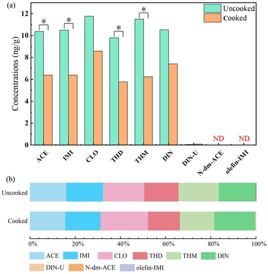 Median concentrations of NEOs in rice before and after the cooking process (plot (a)) and the proportions of each individual NEO in ΣNEOs (plot (b)). The single asterisk (*) represents a significant difference (p < 0.05, t-test), and ND means not detected.