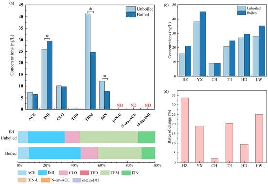 Median concentrations of NEOs in tap water samples obtained from six districts in Guangzhou before and after being boiled (plot (a)), the proportions of each individual NEO in ΣNEOs (plot (b)), median concentrations of IMI in six sample groups (plot (c)), and the median rates of IMI concentration changing (plot (d)). The single asterisk (*) represents a significant difference (p < 0.05, t-test), and ND means not detected. HZ means Haizhu district, YX means Yuexiu district, CH means Conghua district, TH means Tianhe district, HD means Huadu district, and LW means Liwan district.