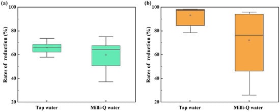 The reduction rates of ∑p-NEOs (plot (a)) and ∑m-NEOs (plot (b)) in rice samples after being cooked with tap water and Milli-Q water. The median concentrations and mean concentrations are represented by straight horizontal lines and small circles, respectively, and the boxes are defined by the 25th and 75th percentiles.