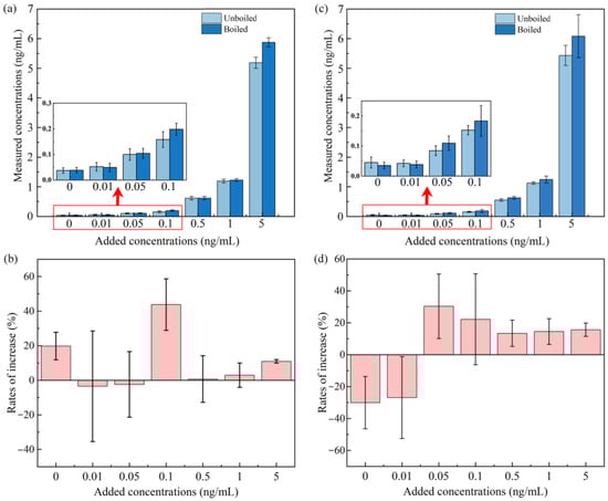 Median concentrations of IMI measured before and after the boiling process in tap water (plot (a)) and Milli-Q water (plot (c)), and the mean rates of increase in tap water (plot (b)) and Milli-Q water (plot (d)).