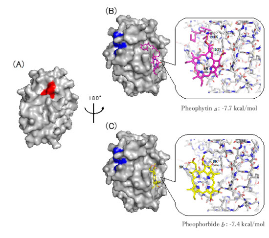 Speculated binding sites of pheophytin a and pheophorbide b to Cat K (PBD code 6QL8). (A) The amino acids composing the active center of cathepsin K are shown in red (S24, C25, W26, N161, and H162). (B,C) The common amino acids involved in the binding of NSC13345 and NSC94914 to Cat K reported previously (K122, R198, and N199) [14,15,16] are shown in blue on the opposite side of Cat K. The active site of cathepsin K (red) is on the front side of Cat K (A). The binding sites of pheophytin a (magenta) (B) and pheophorbide b (yellow), as well as (C) the common binding sites of NSC13345 [14] and NSC94914 [15,16] (blue) (B,C), are located on the back side of Cat K. The grid sizes were set to 68 × 54 × 50 points and 60 × 50 × 54 points for pheophytin a (B) and pheophorbide b (C), respectively, with a spacing of 1.0 Å. The docking scores −7.7 kcal/mol and −7.4 kcal/mol against Cat K for pheophytin a (B) and pheophorbide b (C), respectively, were calculated using AutoDock vina. Amino acids 8R, 191K and 193Y in Cat K are speculated to be involved in the binding to pheophytin a, and amino acids 8R and 9K in that to pheophorbide b.