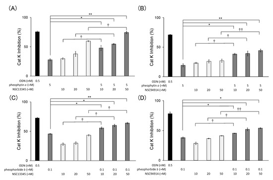 Additive inhibition of Cat K by pheophytin a and pheophorbide b with NSC13345 and NSC94914. Inhibition of Cat K activity by pheophytin a and pheophorbide b with and without NSC13345 and NSC94914 was examined. Odanacatib (ODN), a known Cat K inhibitor, was used as a positive control. Results are presented as mean ± SD (n = 3). * p < 0.05, ** p < 0.01 vs. pheophytin a only (A,B) and pheophorbide b only (C,D). † p < 0.05, †† p < 0.01 vs. without pheophytin a (A,B) and pheophorbide b (C,D) by Student’s t-test.
