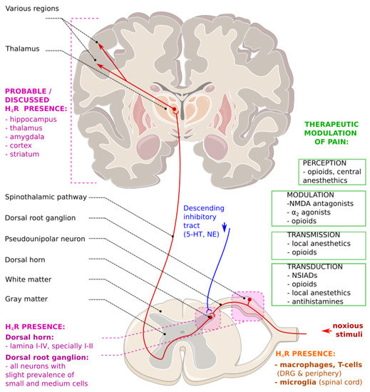 The presence of H4Rs in the CNS has been controversial and discussed by the research community in recent years [16,17,18,19]. Some reports indicate the presence of H4R on sensory nerves in the dorsal root ganglia and in the spinal cord [20,21,22]. The location of H4R coincides with the pathways of pain transmission (Figure 1) [23,24], supporting the modulatory role of H4R in this process [25,26].