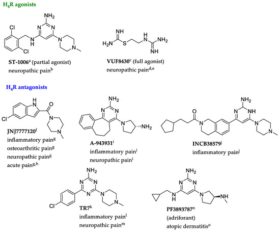 Structures of selected H4R ligands: agonists and antagonists with pharmacological activity in vivo. Information from a [41], b [22], c [42], d [28], e [29], f [43], g [31], h [32], i [33], j [34], k [44], l [35], m [36], n [45], o [39].
