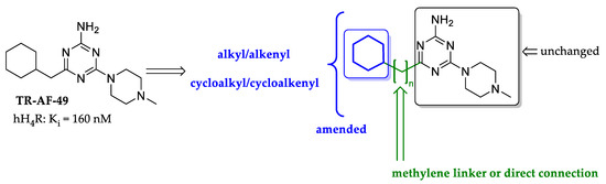 The search for new compounds with biological activity can be inspired by compounds found in various types of extracts and natural products [59] or publications by other authors, which are especially useful in the search for effective ways to fight cancer or infection diseases, e.g., SARS-CoV2 [60]. Recently, we have published a series of compounds, alkyl derivatives of amine-1,3,5-triazine, which showed promising H4R in vitro and in vivo activity [61]. The most potent compound from those series, TR-AF-49 (Figure 4) was chosen as a lead structure for further modifications and a new series of alkyl derivatives was designed (Figure 4), synthesized, and pharmacologically evaluated in vitro for human H4R (hH4R) affinities. Next, the complicated pharmacology of previously tested compounds (i.e., TR7) and the fact that H4R may represent the features of functional selectivity [62] encouraged us to expand the scope of the investigation to more than one signal transduction pathway (cAMP and ß-arrestin). Next, the most promising compound from the new series was evaluated for toxicity (in HepG2 and SH-SY5Y cells) and artificial membrane permeability (in PAMPA assay), and finally was tested in in vivo inflammatory pain models and pruritus models.