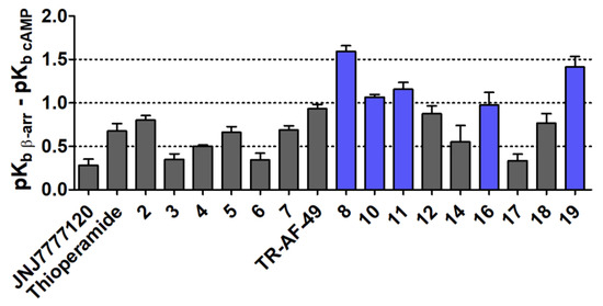 All tested compounds showed bias towards the β-arrestin pathway (Table 3, Figure 5). In general, triazine derivatives with aliphatic moiety (10–19; Table 3, Figure 5) showed higher bias towards the β-arrestin pathway than those with alicyclic fragments (2–8; Table 3, Figure 1). The highest bias towards the β-arrestin pathway (bias factor ≥ 1) was observed for compounds 8, 10, 11, 16, and 19, while the most balanced activity (bias factor ≤ 0.5) was determined for compounds 3, 6 and 17. Among alicyclic derivatives, the analysis of the bias factor vs. compound structure relationship showed that compounds with a 6-membered ring always represented higher bias for the β-arrestin pathway than the ones with a 5-membered ring (8 vs. 7; TR-AF-49 vs. 6; 5 vs. 4; Table 3, Figure 5). The structure element that could be linked to higher bias among aliphatic derivatives (except 11) was straight aliphatic moiety over branched (12, 14 vs. 10; 17, 18 vs. 16). The most active H4R ligand in the whole series (6), presented balance activity towards both cAMP and β-arrestin pathways.